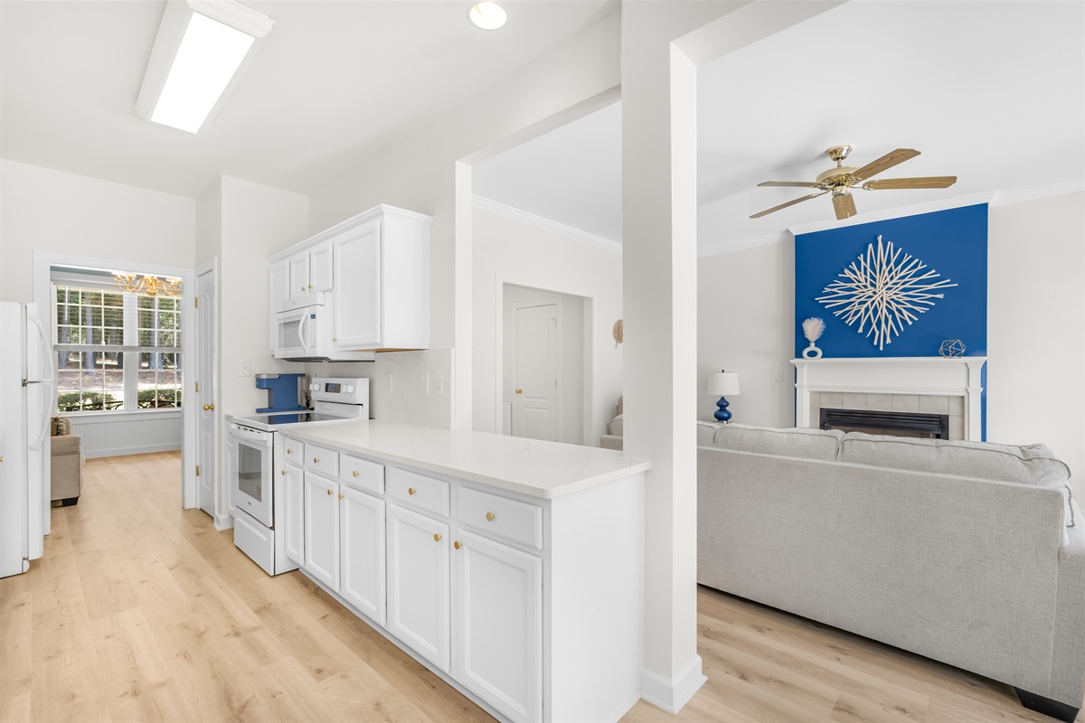 The heart of the home is its open-concept living space, where a smart TV creates a warm, welcoming area to gather. The kitchen has been tastefully remodeled with quartz counters and a sleek quartz backsplash. It's fully stocked and ready for meal prep, with coffee provided for your mornings. A half bathroom is located downstairs, and the office features a desk and two monitors for remote work, along with a seating area.