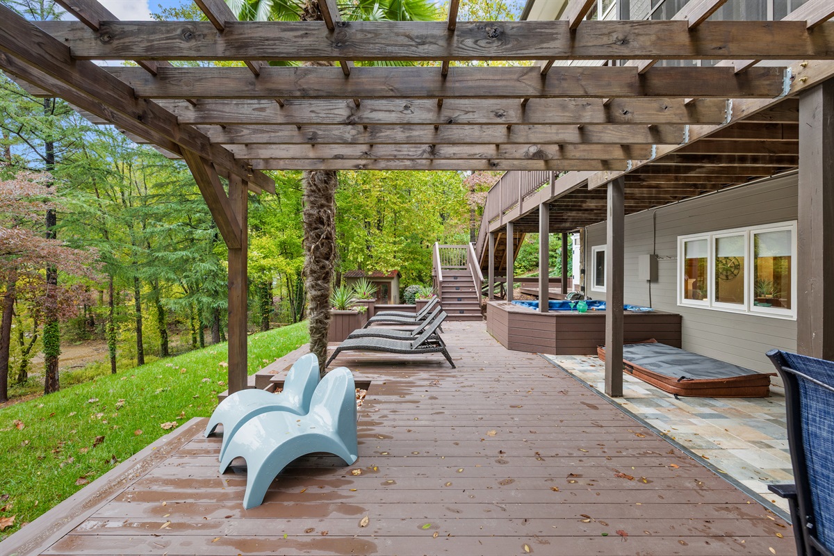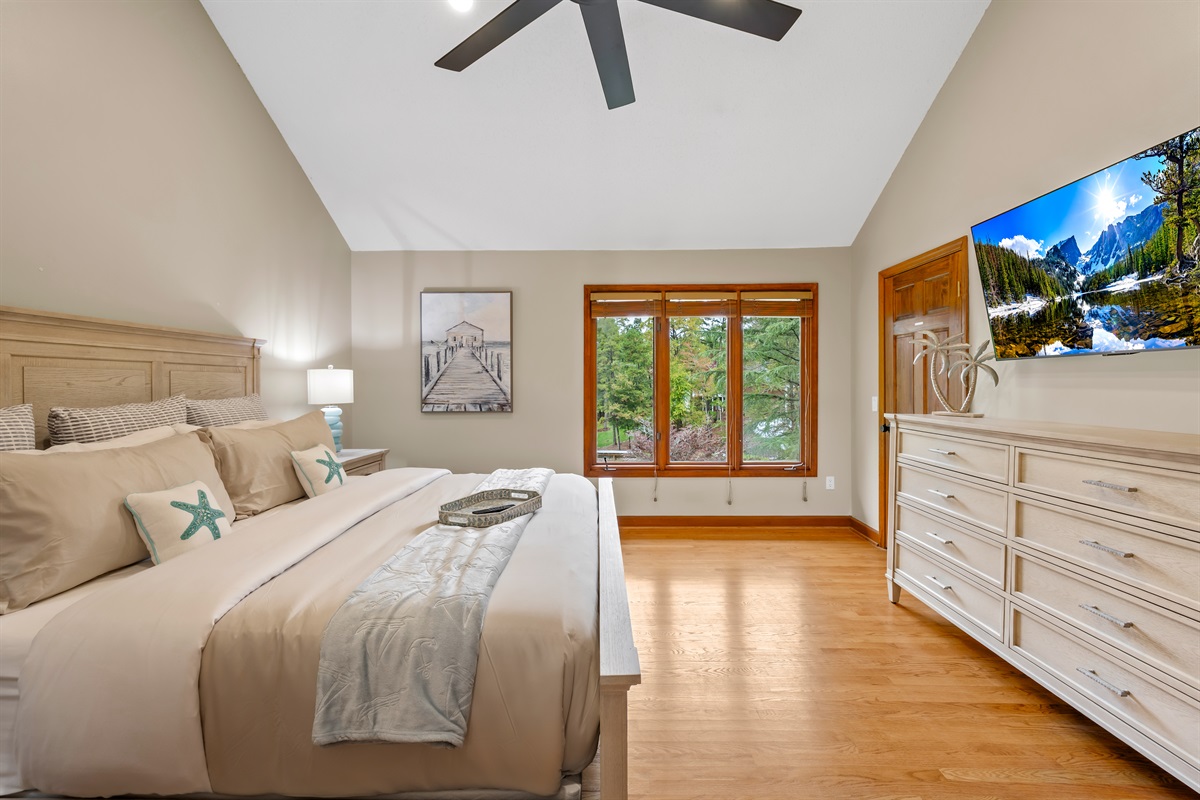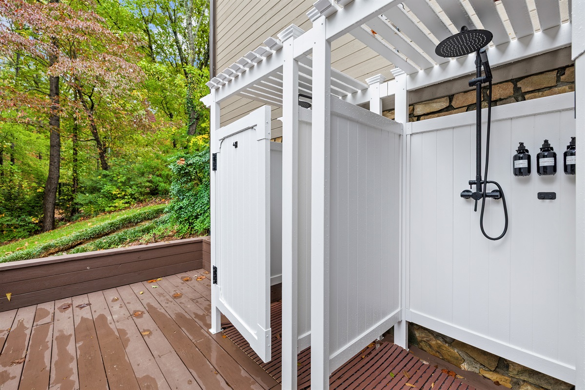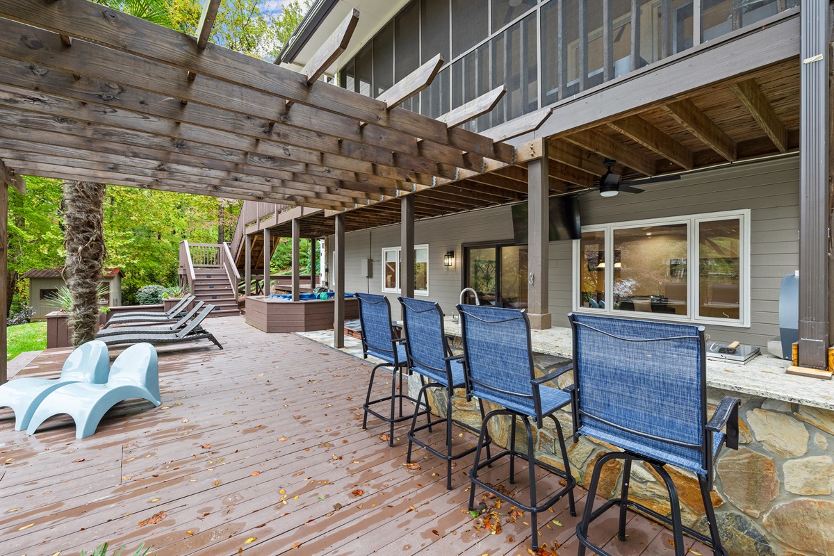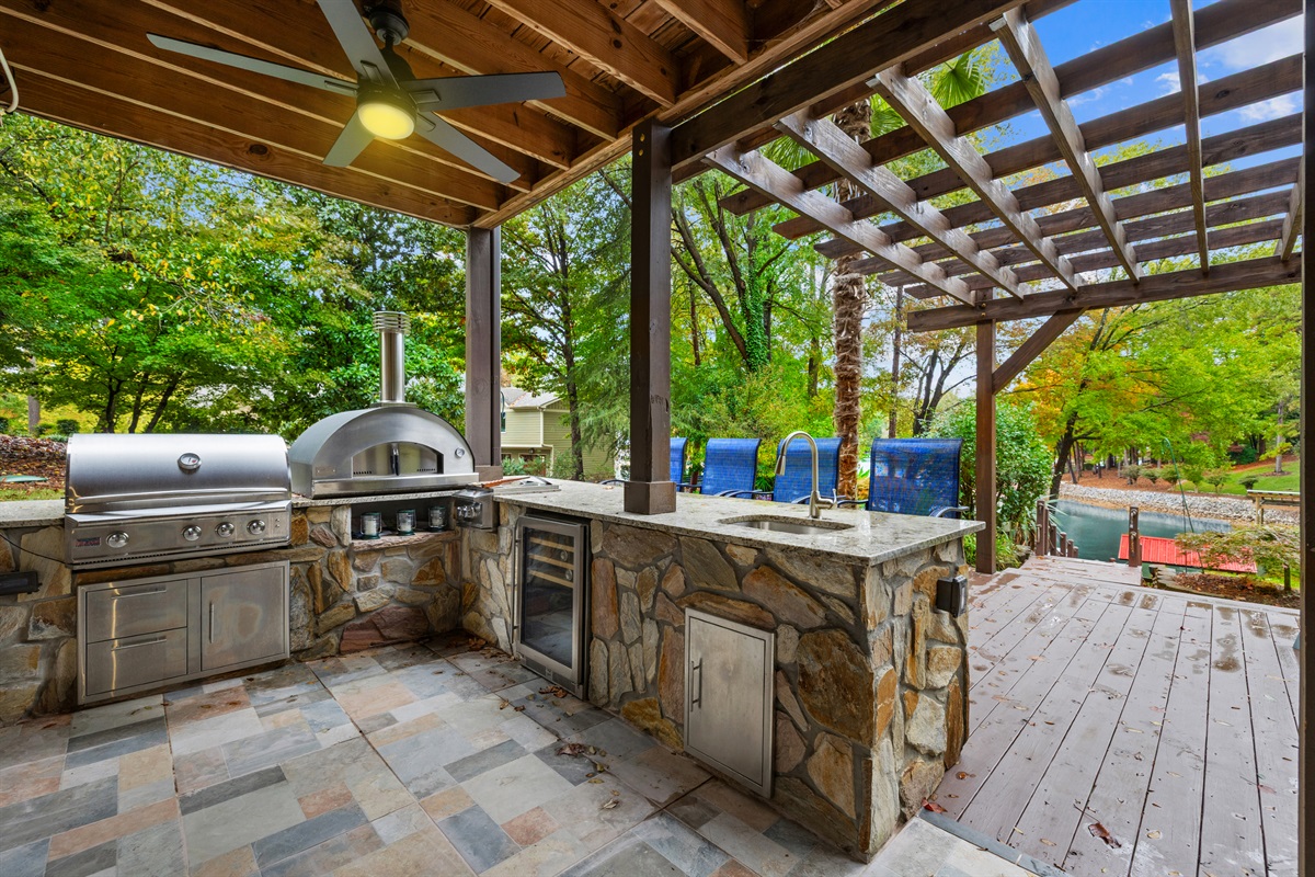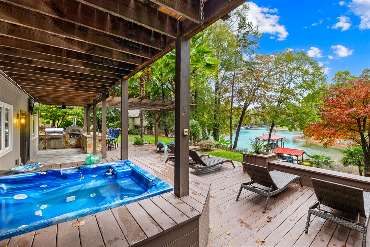Step outside to your private paradise: an outdoor kitchen with pizza oven, grill, sink, drink fridge, and TV, plus an island for hanging out with family and friends. Unwind in the brand-new hot tub, or rinse off in one of the two heated outdoor showers after a day on the lake.