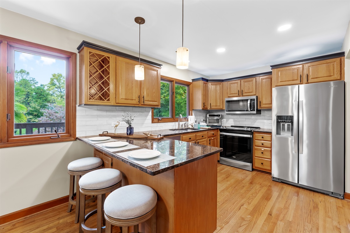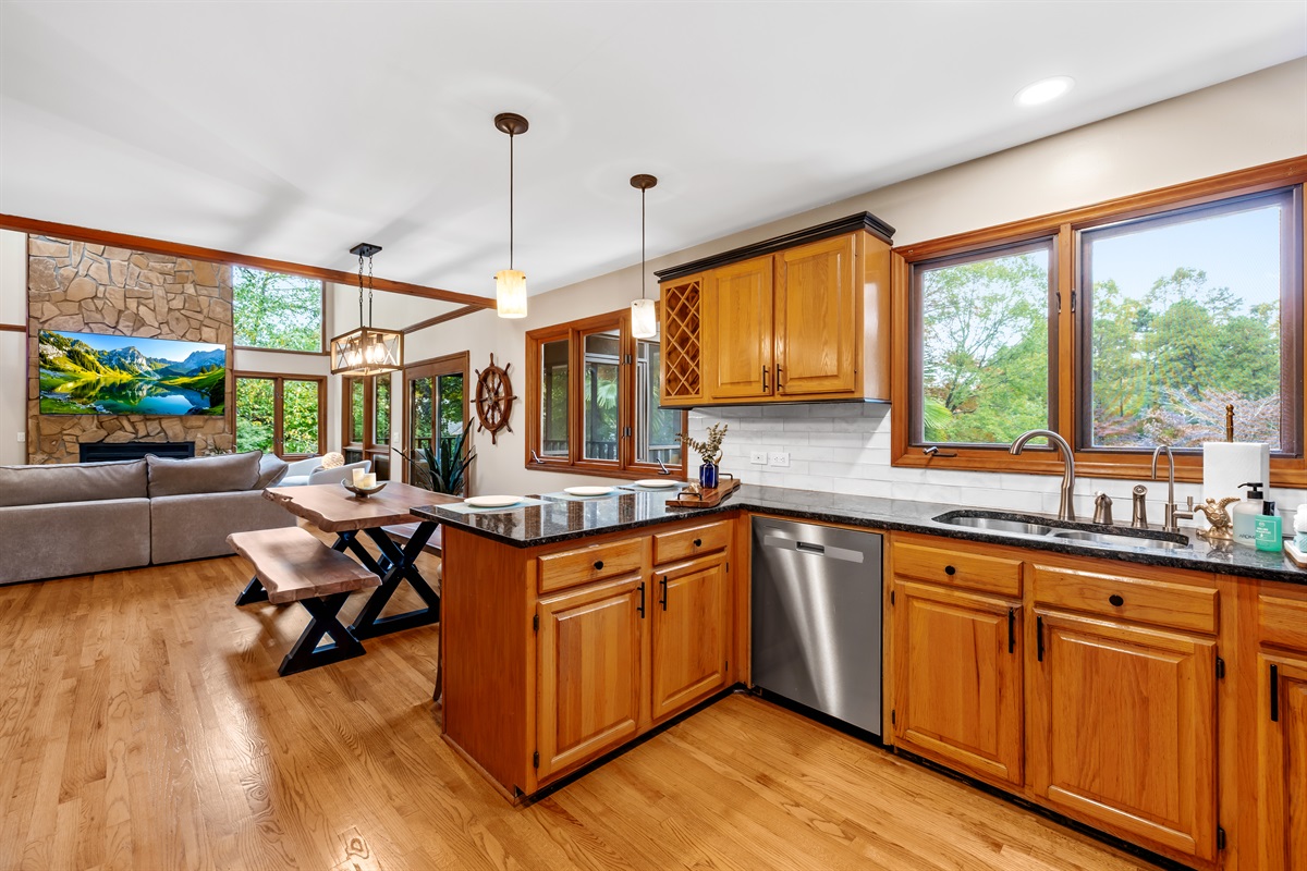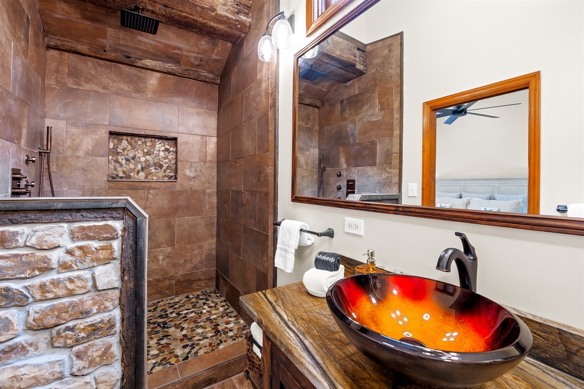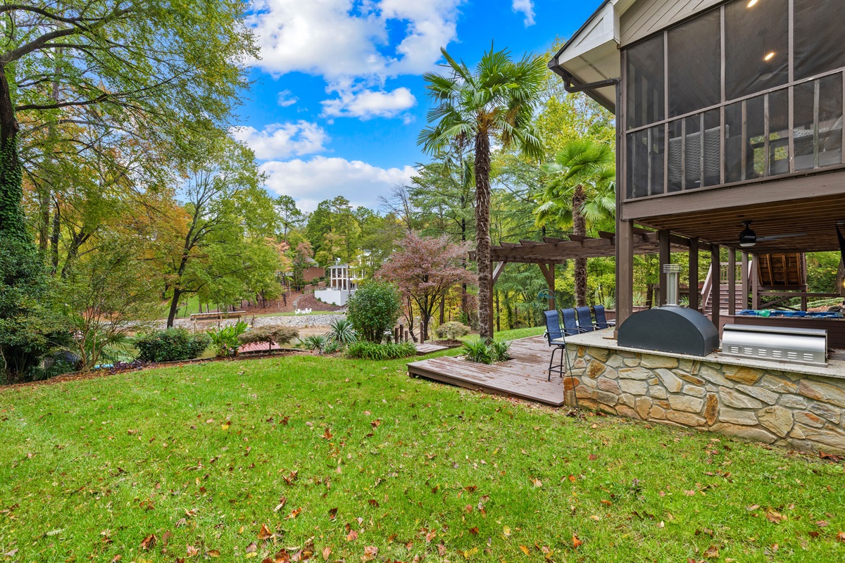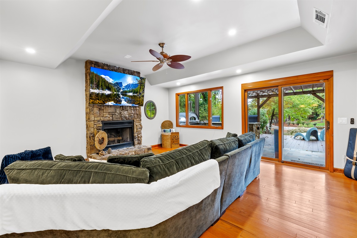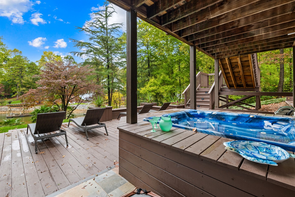 Step outside to your private paradise: an outdoor kitchen with pizza oven, grill, sink, drink fridge, and TV, plus an island for hanging out with family and friends. Unwind in the brand-new hot tub, or rinse off in one of the two heated outdoor showers after a day on the lake.