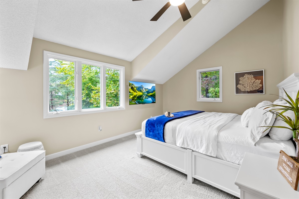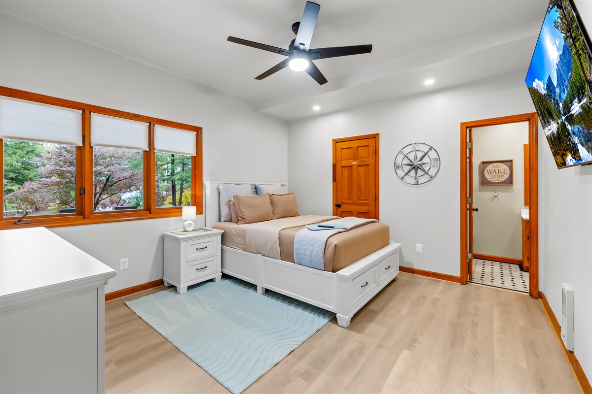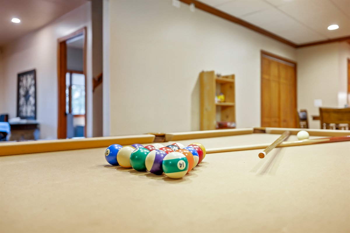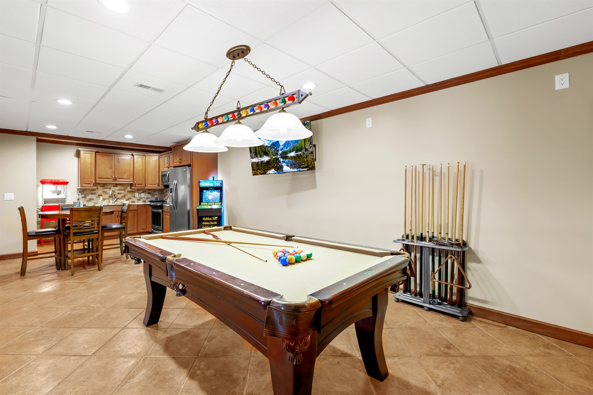 The main floor includes 2 bedrooms and a full bath, while the upstairs king suite boasts serene lake views and an ensuite bath, along with a 2nd lake facing king bedroom. Downstairs you'll find another queen bedroom with ensuite bathroom, and the walkout basement is made for gathering — featuring a massive smart TV, pool table, treadmill, and a full secondary kitchen.
