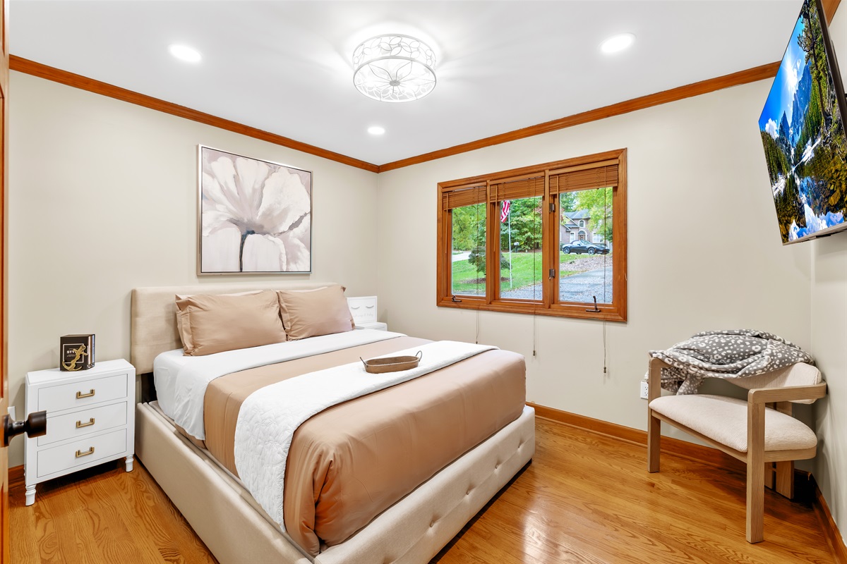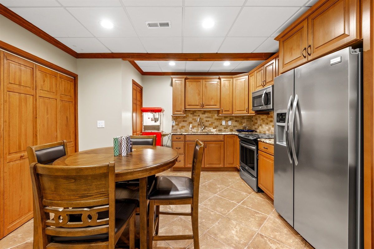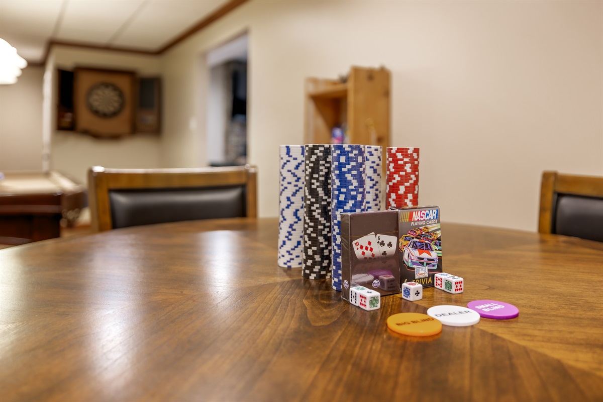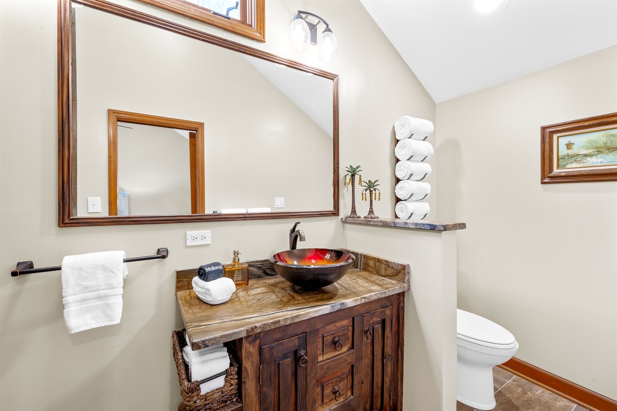 The main floor includes 2 bedrooms and a full bath, while the upstairs king suite boasts serene lake views and an ensuite bath, along with a 2nd lake facing king bedroom. Downstairs you'll find another queen bedroom with ensuite bathroom, and the walkout basement is made for gathering — featuring a massive smart TV, pool table, treadmill, and a full secondary kitchen.