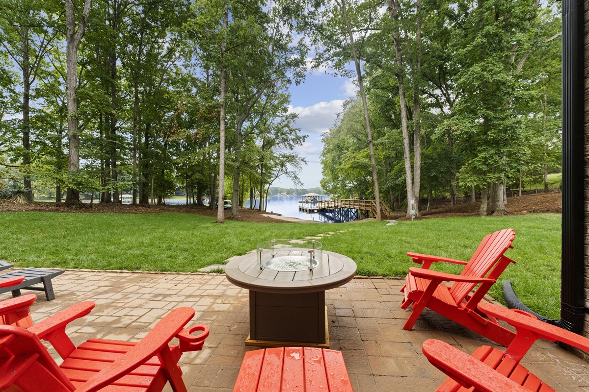 The outside area of Tranquil Cove offers a patio terrace with overhead accent lighting, a 42” propane fire pit table with Adirondack and chaise lounge chairs. There are yard games and a private dock to moor a boat and jet ski. You will also find 3 kayaks, 1 canoe, and 2 paddleboards for your use with easy access to launch them from their storage rack. New fully fenced yard (except lakeside) to keep the pets contained, but with plenty of room to roam.